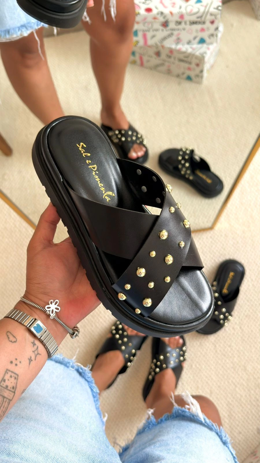 A Flat Tasha é a escolha perfeita para quem busca unir conforto e estilo em um único calçado. Com design moderno e tiras cruzadas em material sintético de alta qualidade, ela se destaca pelas tachas douradas que dão um toque fashion e sofisticado ao visual.